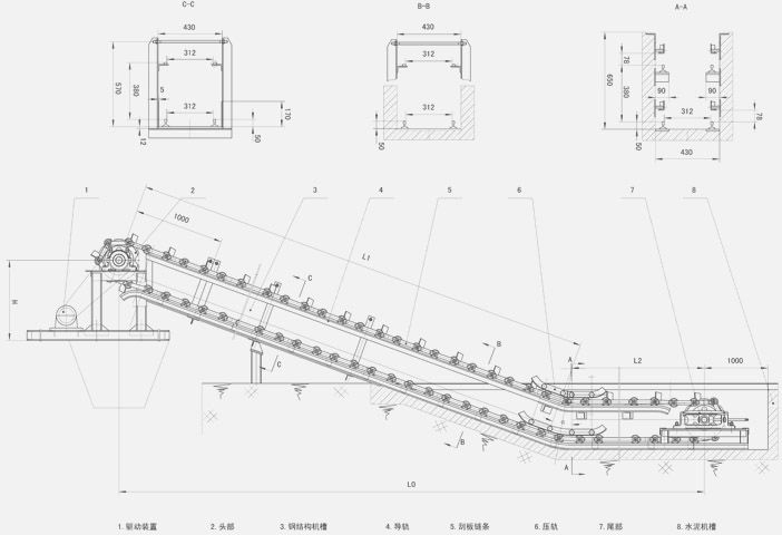 一條刮渣機(jī)可以有水平段和傾斜段變角度輸送,傾斜段的傾角可達(dá)40°。